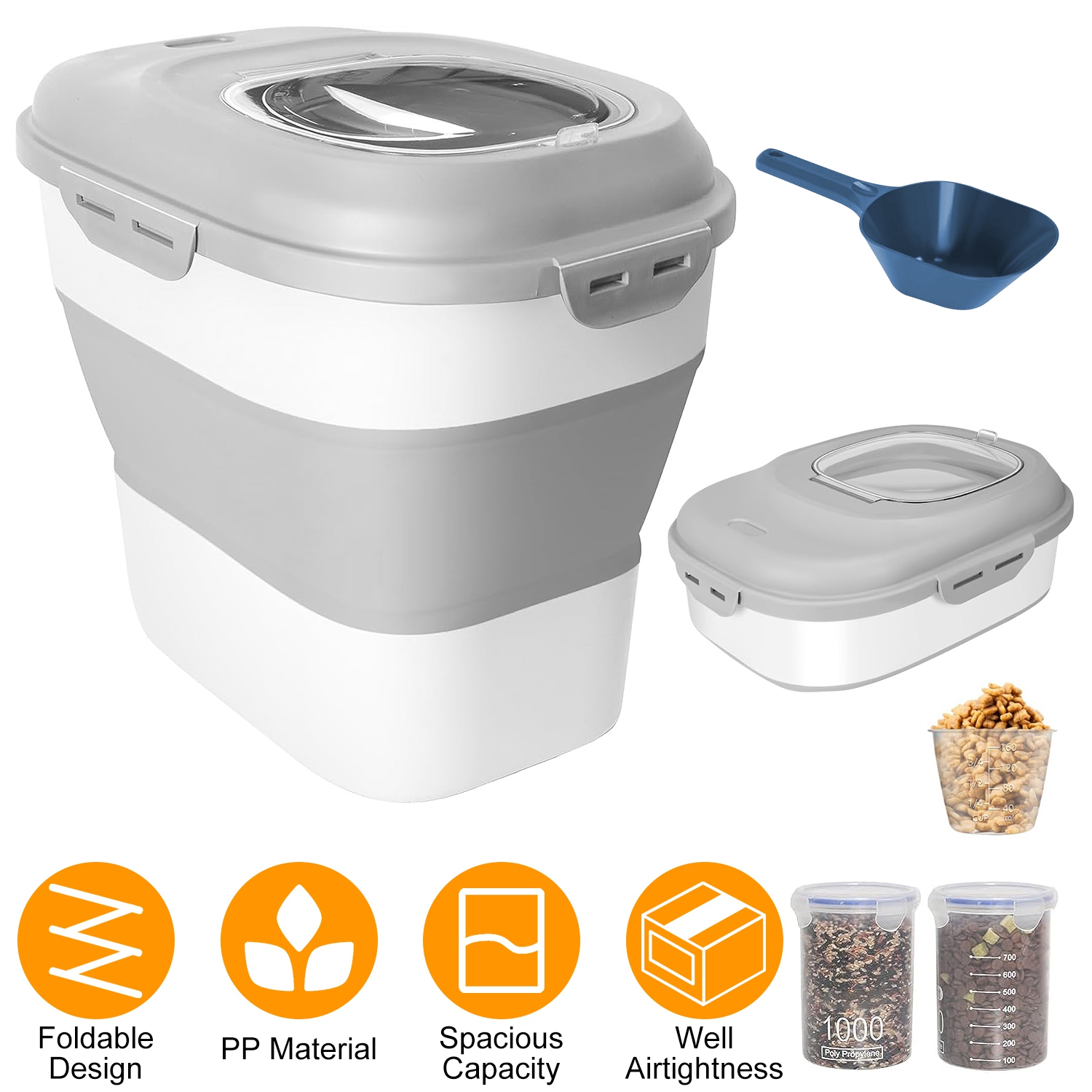 Our collapsible food storage container is a versatile and convenient solution for all your food storage needs, such as rice, flour, nuts, pet food. Featuring an upgraded foldable design, the dog food container can hold up to 55lbs of food when unfolded, and up to 16.5lbs of food when folded. 2Pcs rolling wheels is convenient to move around, and the transparent flip-over lid allows you to easily check the remaining food capacity without opening. Silicone sealing circle provides excellent airtightness while built-in desiccant card slot keeps bugs and rice weevil away, keeping your food fresh and safe for longer periods. Ample accessories include measuring cup, food scoop and 2pcs 34oz airtight containers, providing you with extra kitchen pantry tools for an all-in-one storage solution.