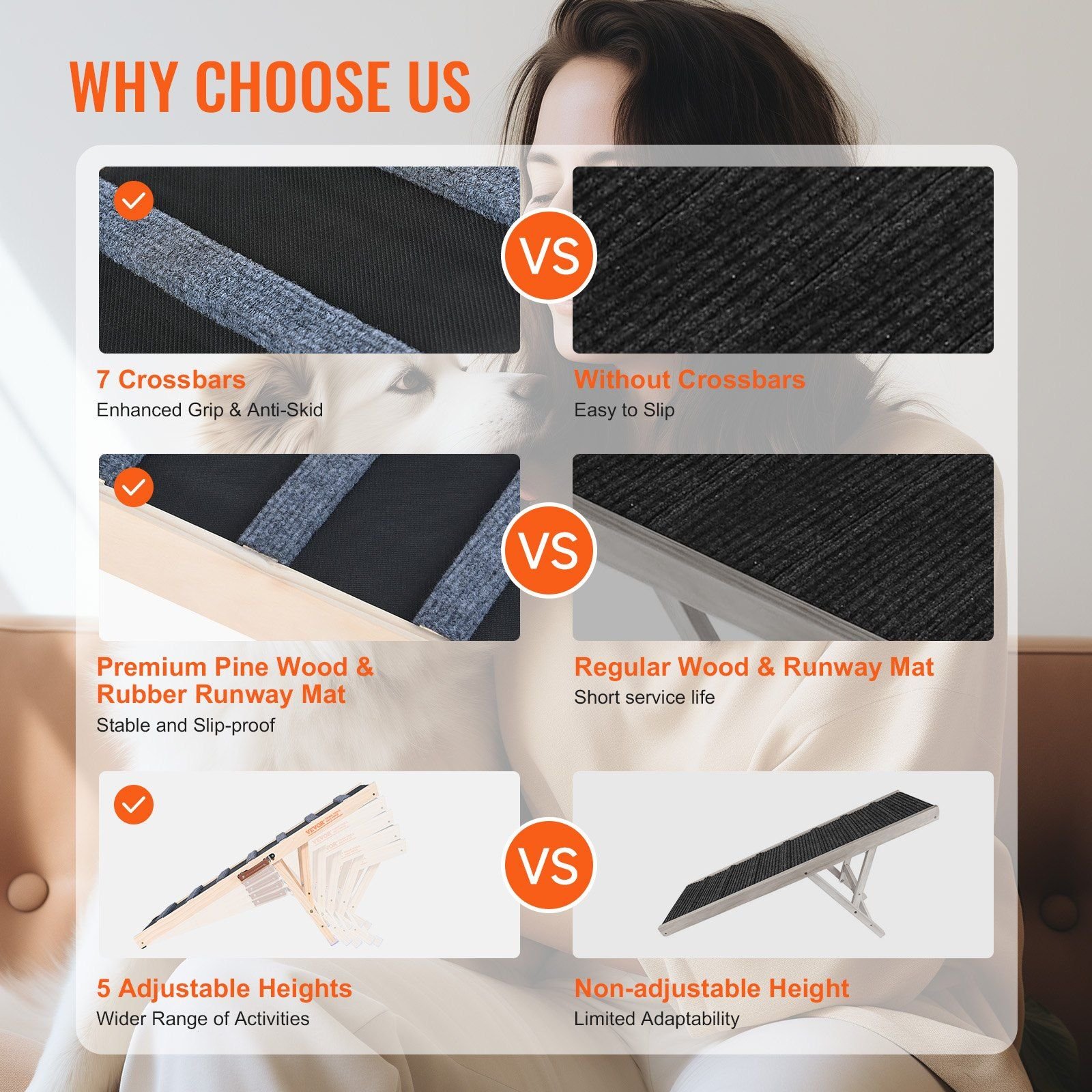 Crafted with premium pine wood, this adjustable dog ramp is exceptionally stable and durable. Its triangular structure adds extra strength, and the bottom slip-proof pads enhance stability. With its outstanding performance, it remains sturdy even when bearing people.
