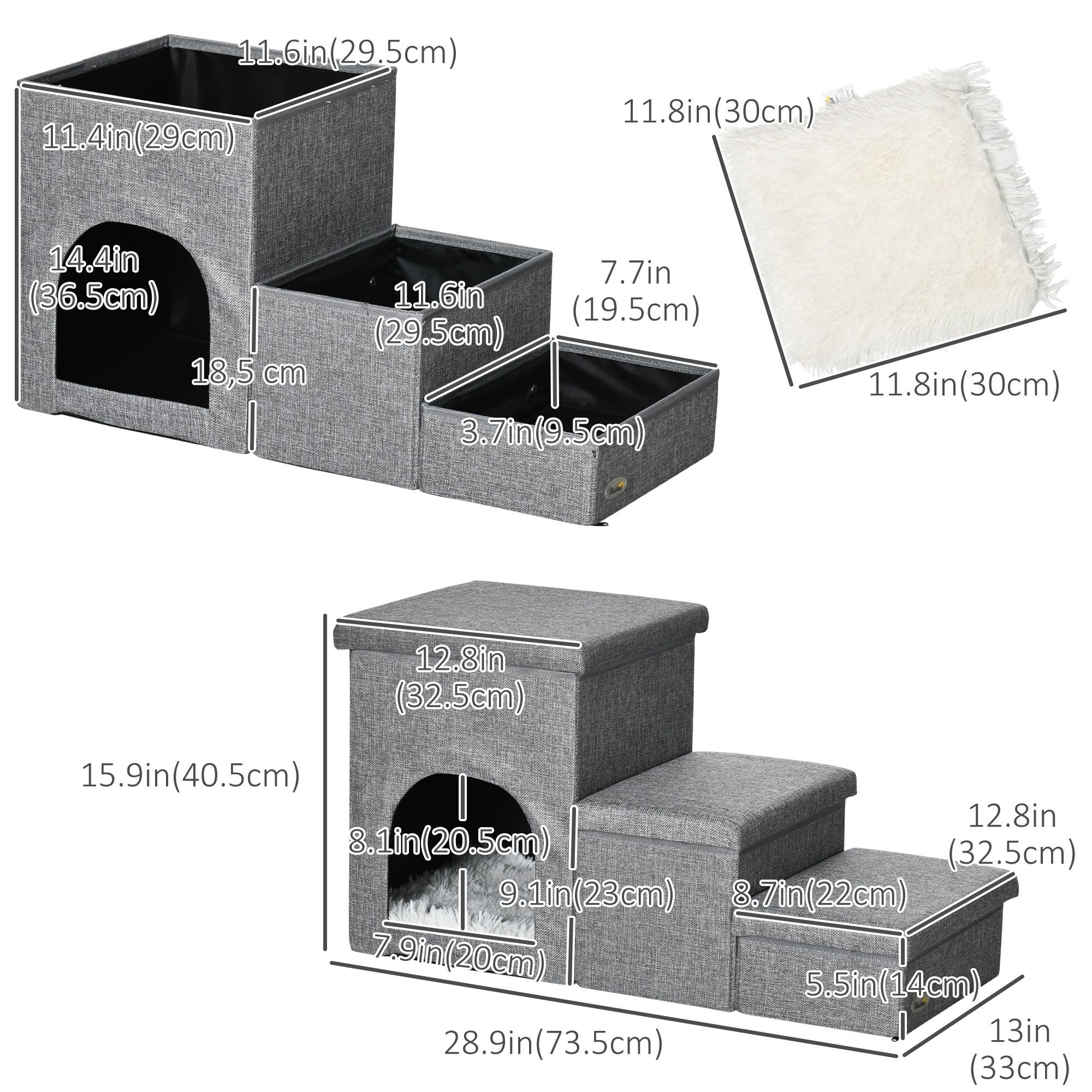 • • Step Size (from bottom to top): 12.8" L x 8.7" W x 5.5" H (32.5L x 22W x 14H cm), 12.8" L x 8.7" W x 9.1" H (32.5L x 22W x 23H cm), 12.8" L x 12.8" W x 15.9" H (32.5L x 32.5W x 40.5H cm)