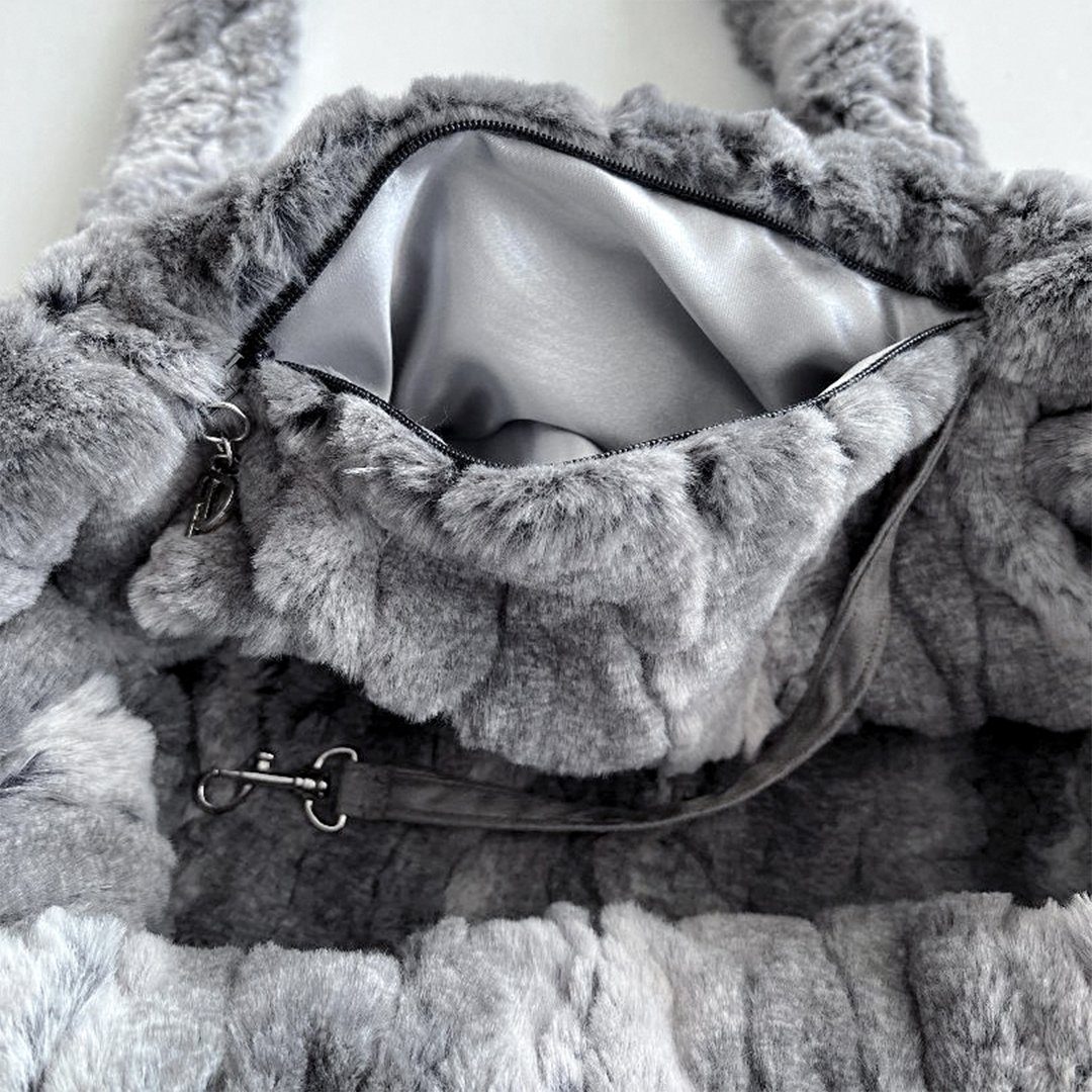 "The Granite Dog Carrier by Hello Doggie is ultra minky and oh so soft! Made and lined with  luxurious Deluxe Granite fabric, featuring a satin pocket for treats with a YKK zipper. This carrier features a safety tether and a snap for closure, along with a comfortable headrest so your pup has enough room to see the world as you're carrying prince or princess.   LIMITED EDITION    One Size    15"" L x 6"" W x 10"" H | For dogs up to 7lbs  MSRP $196.00  *Carrier is handmade, size may vary slightly. Made in USA.* "