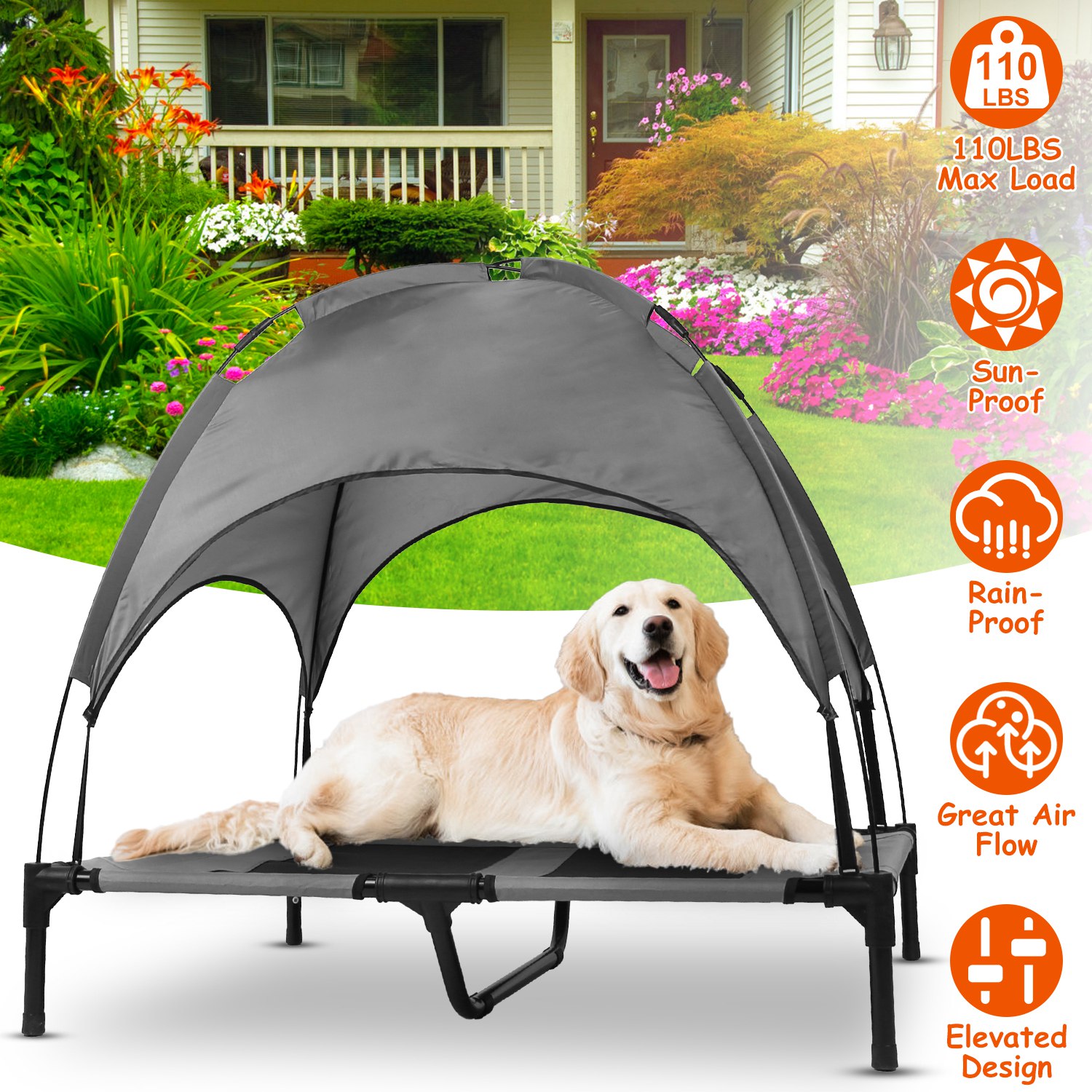 Our elevated pet bed provides your pets with a place to have fun and helps them to have a cool summer. The feet height of the pet bed is 7.48in, which can raise your pet up off the ground, keeping your pets away from damp or hard surfaces, care for the joint health of your pets. Raised design with mesh cloth also promotes airflow on all sides of the bed to keep them cool and content. Detachable canopy can prevent strong UV and block the rain effectively. Optimal for outdoor use. You can also detach the canopy and use it as a normal bed for your pet indoor. Made from durable 600D oxford and solid steel frame, the Raised Pet Cot is able to withstand a dog’s scratching paws and hold up to 110lbs pets. Take this home now and bring your lovely furry friends vitality in their life!