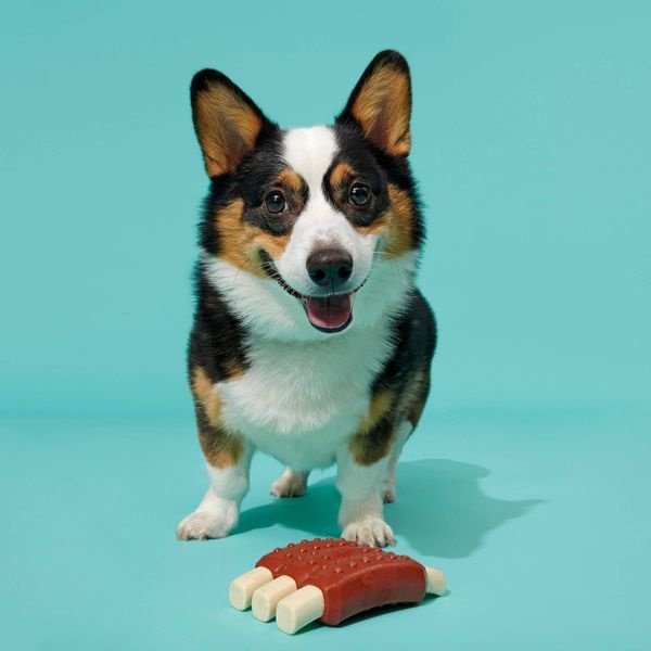 "This rubber and nylon dog toy will have your Super Chewer all up in your grill. Made for 2-zone chewing, this toy features barbecue scented rubber over a natural smoke scented nylon core that will leave your dog stuck to Wreck of Ribs long after the coals have cooled. No need to bring a spare, these babies got back!