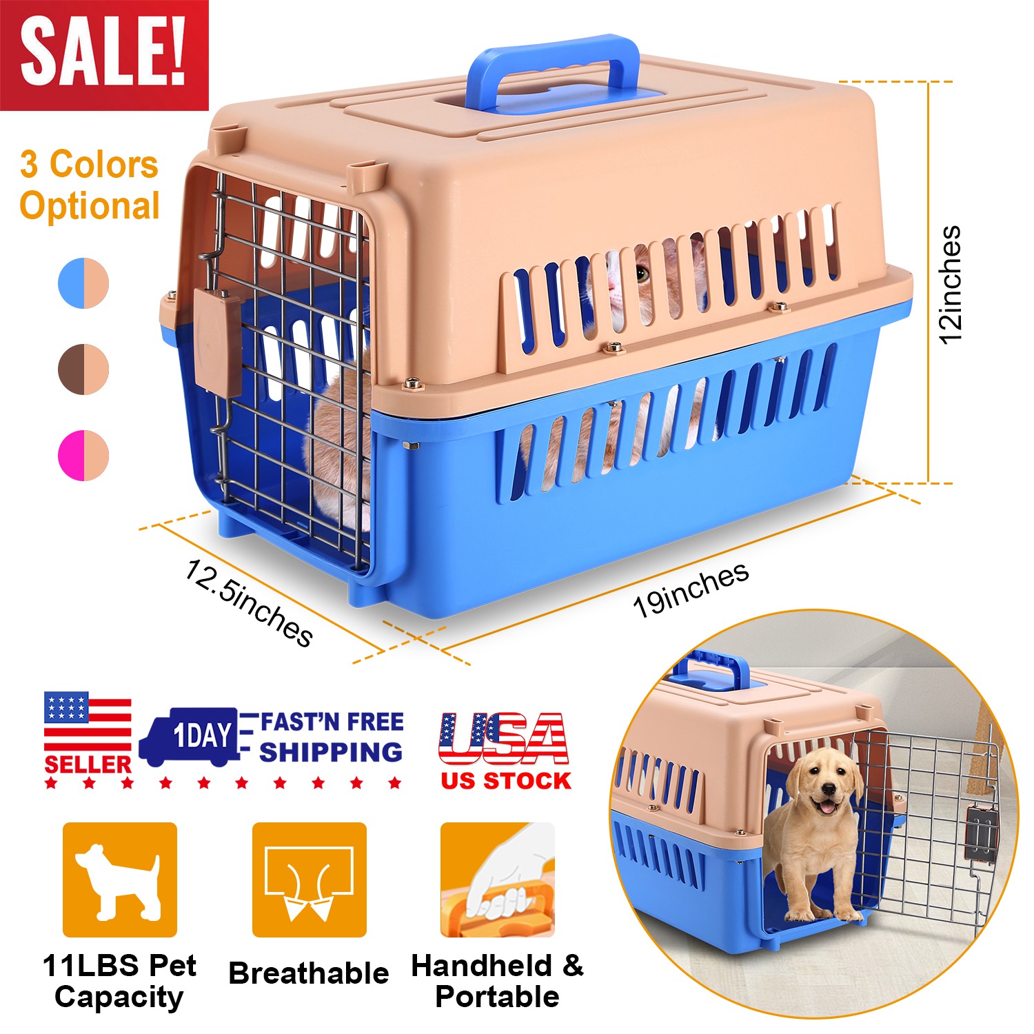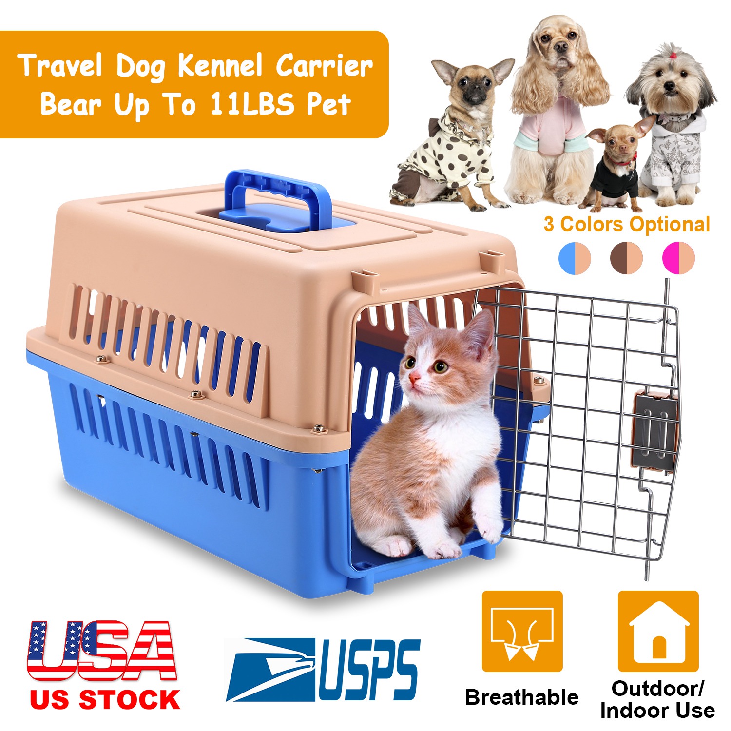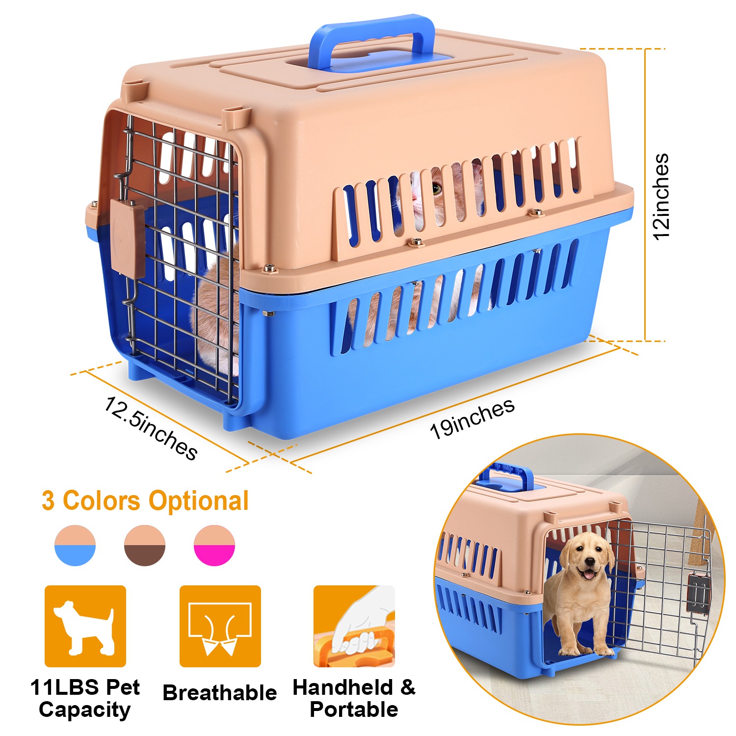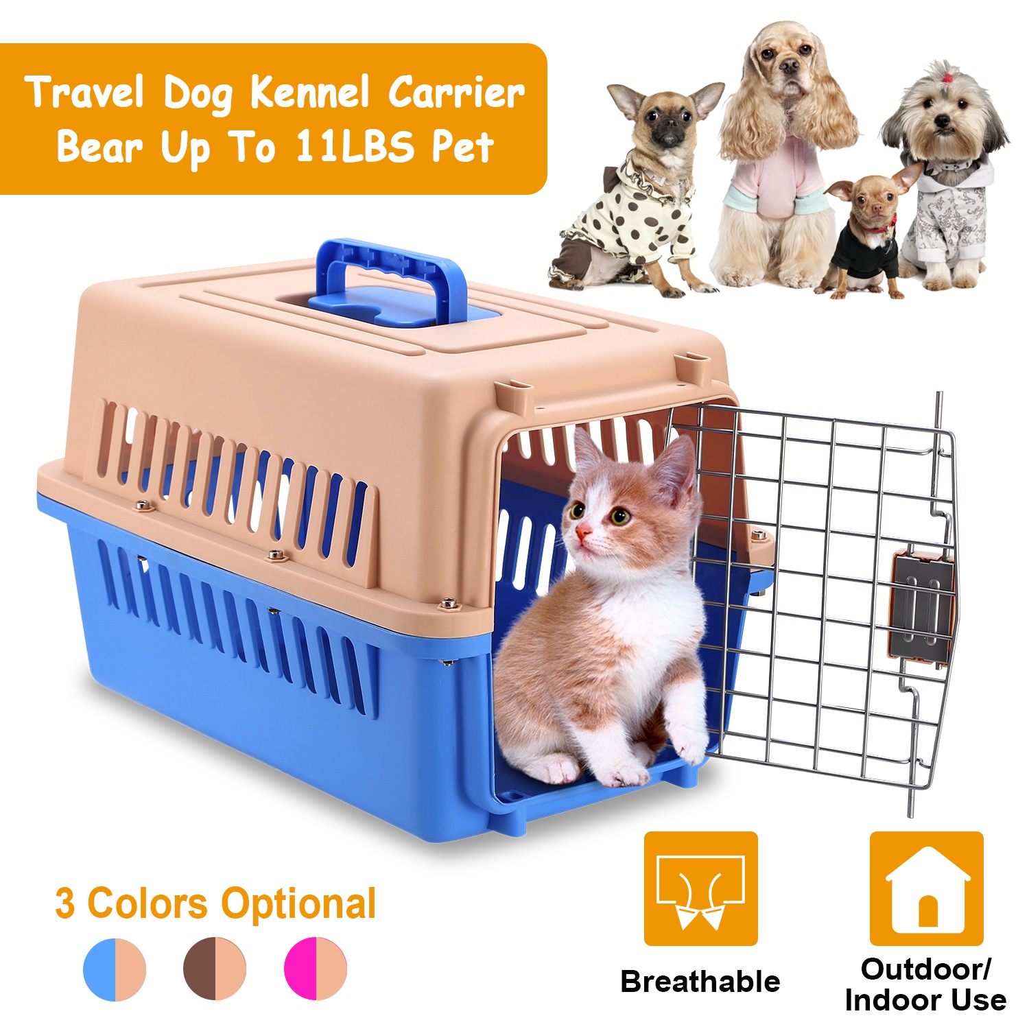 Our Pet Kennel provides pets a with a comfortable and safe travel experience. The Q235 carbon steel door with a squeeze latch and strong plastic shell provide durability. The ventilation openings surrounding our travel kennel give pets a fresh flow of air and improved visibility. Detachable bottom and top with 19x12.5x12inches space can hold the pets up to 11lbs.Easy assembled and handheld design offering a wonderful experience for pets and pet parents who love the outdoors.